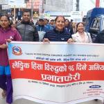 रामेछाप— रामेछापमा लैङ्गिक हिंसा विरुद्धको १६ दिने अभियान कार्यक्रम औपचारिक रूपमा आजबाट प्रारम्भ भएको छ । जिल्ला सदरमुकाम मन्थलीमा मन्थली नगरपालिकाको आयोजनामा मङ्गलवार बिहान प्रभात फेरी गरी अभियान सुरु भएको हो । मन्थलीको मदन भण्डारी चोकबाट सुरु भएको ¥याली मन्थली बजार परिक्रमा गरी जिल्ला समन्वय समितिको प्राङ्गणमा पुगेर कोण सभामा परिणत भएको थियो । सभालाई सम्बोधन गर्दै वाग्मती प्रदेश सभा उद्योग, पर्यटन तथा वातावरण समिति सभापति आनन्दकुमार श्रेष्ठले लैङ्गिक हिंसा विरुद्धको अभियान १६ दिन होइन ३ सय ६५ दिन नै आवश्यक रहेको बताए । उनले यस्ता विषय कानुनमा लेखेर मात्र नहुने बताउँदै व्यवहारि