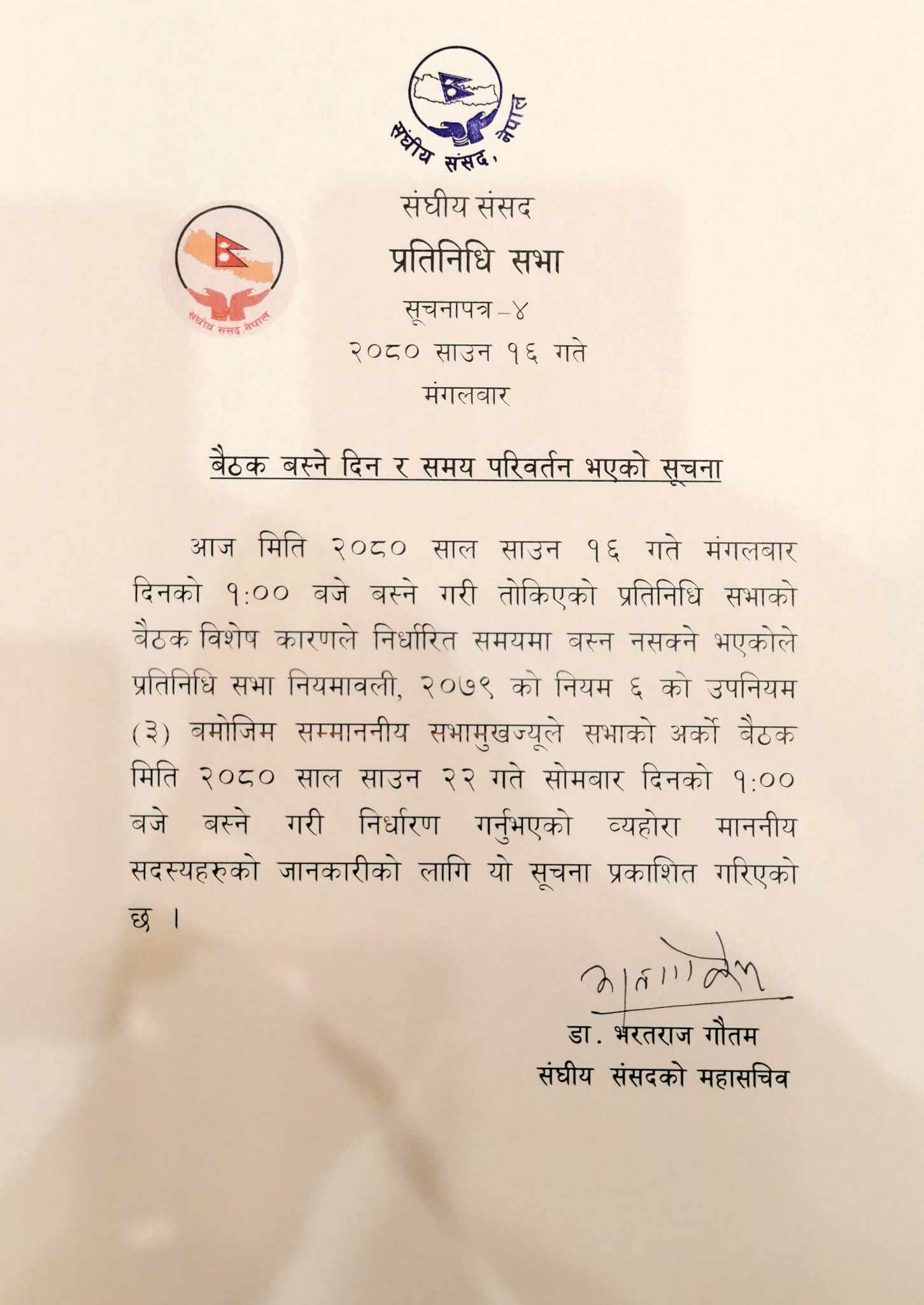 मंगलबार दिउँसो १ बजेका लागि बोलाइएको बैठक बस्दैन नबसी २२ साउनलाई सारिएको हो । संघीय संसद सचिवालयले मंगलबार एक सूचना जारी गरी प्रतिनिधिसभा बैठक २२ साउनको दिउँसो १ बजेका लागि तोकिएको छ ।