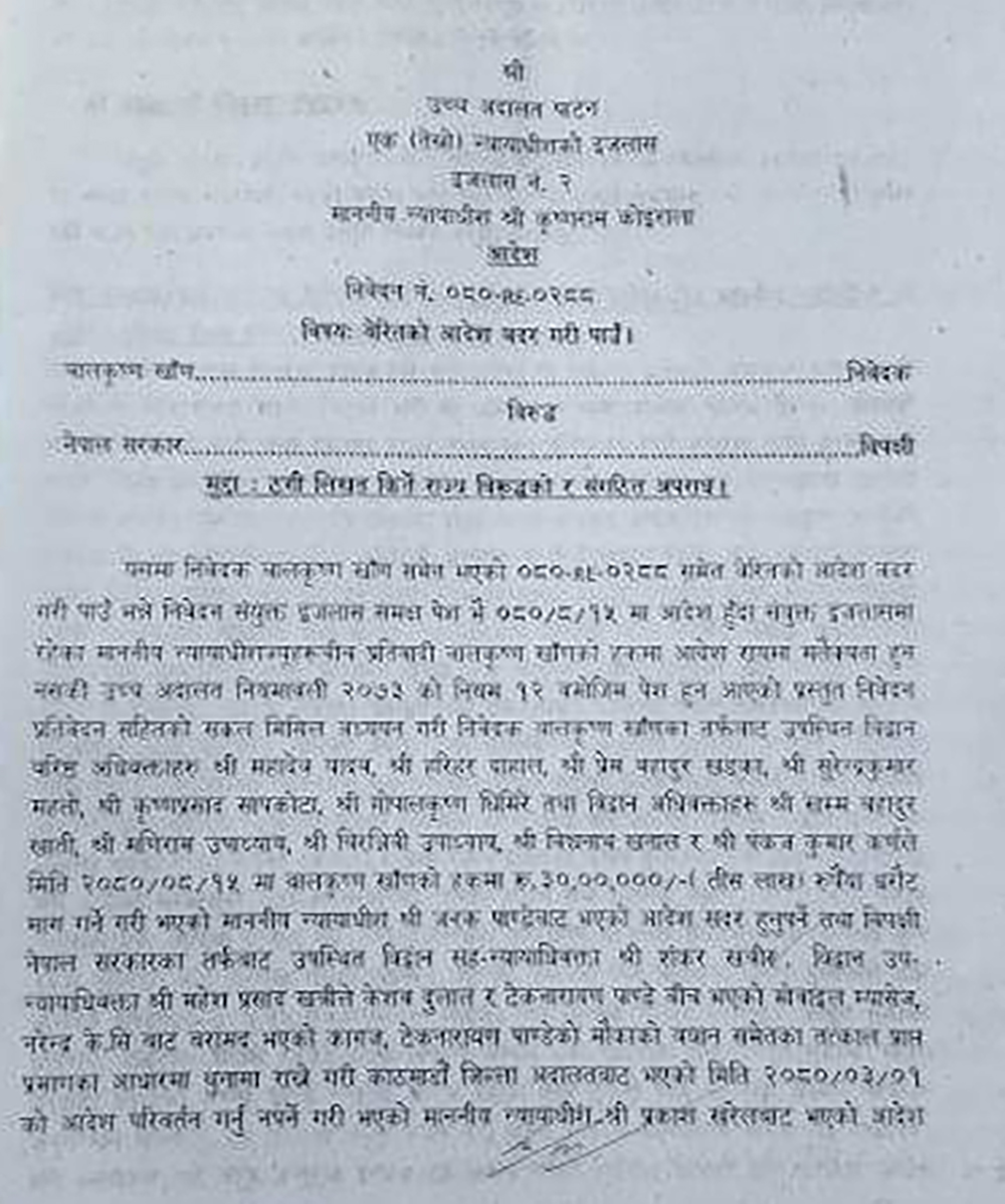 काठमाडौँ । नक्कली भुटानी शरणार्थी प्रकरणमा पुर्पक्षको लागि थुनामा रहेका पूर्वगृहमन्त्रीसमेत रहेका नेपाली काँग्रेसका केन्द्रीय सदस्य बालकृष्ण खाँणलाई धरौटीमा छाड्न उच्च अदालत पाटनले आदेश दिएको छ। उच्च अदालतका न्यायाधीश कृष्णराम कोइरालाले खाँणलाई बिहीबार धरौटीमा छाड्न आदेश दिएका हुन्।