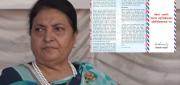 काठमाडौं— पूर्वउपराष्ट्रपति विद्यादेवी भण्डारीले आफूमाथि पार्टीले कुठाराघात गरेको गुनासो गरेकी छन् । आजबाट सुरु हुने नेकपा एमालेको दोस्रो विधान महाधिवेशनका प्रतिनिधिहरुलाई पत्र लेख्दै भण्डारीले गुनासो पोखेकी छन् । उनले आफूलाई पार्टीले निर्णय गरेर राष्ट्रपति हुन पठाएको र आफूले निष्ठापूर्वक काम गरेर फर्किँदा काममा बन्देज लगाइएको भन्दै आफूले उठाउँदै गरेको आवाज आफ्नो लागि मात्र नभएको बताइन् । ‘म अहिले एउटा यस्तो परिवेशमा उभिएको छु, मैले २०३७ सालमा प्राप्त गरेको पार्टी सदस्यता जो मेरो गहिरो आस्था र विश्वासको प्रतीक समेत हो, त्यसमा कुठाराघात गर्ने प्रयास गरिएको छ,’ उनले भनेकी छन्, ‘पा